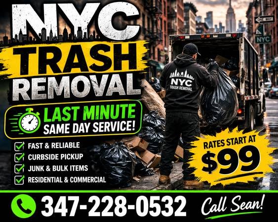 Hi, I'm Sean, owner and operator, offering professional junk removal services 24/7, 365 days a year in Queens and the NYC area. We provide affordable rates and will beat any reasonable price. With 21 years of experience and legal dumping, we remove all types of junk including furniture, construction debris, appliances, yard waste, and more. Our fleet includes a 16ft truck, cargo van, and 20ft box truck for any job size. Services include apartment cleanouts, foreclosure cleanouts, restaurant equipment removal, estate cleanouts, and demolition debris removal. We handle all labor and guarantee quick, easy, and professional service. Call Sean at 347-228-0532 for same-day service and the best rates in town.