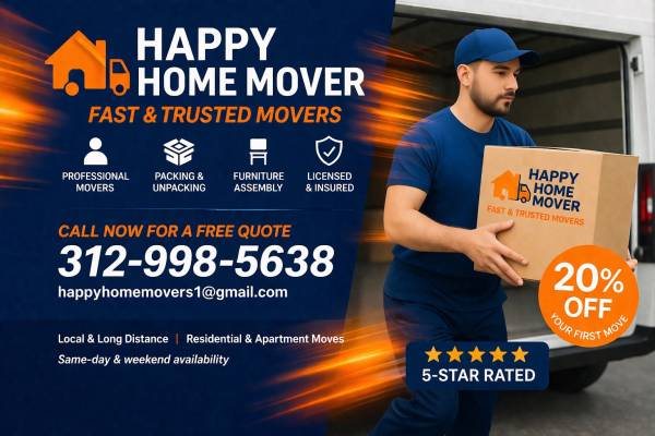 We offer the best moving prices in Chicago and nearby suburbs. Our services include hauling, junk removal, local and long distance moving, with mask and glove safety measures. Call 312-998-5638 for a free estimate or visit happy-home-movers.com to get a free quote. We provide same day or scheduled moving, free packing, 2-5 movers available, multiple trip capability, commercial and residential moves, pickup and delivery of small items, and furniture rearrangement. Minimum 2 hours service.