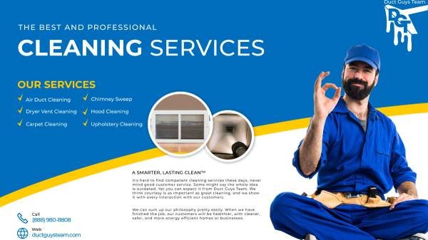Call us at (888) 980-8808 for commercial and residential cleaning services. We offer free estimates and inspections. Air duct cleaning starts at $69 with options for dryer vent cleaning. Chimney sweep and inspection available for $32. Carpet cleaning specials from $9 per room. Upholstery cleaning for sectional sofas at $39. Power washing services range from $59 to $159 depending on area size. Satisfaction guaranteed on all services. Visit DUCTGUYSTEAM.COM for more information.