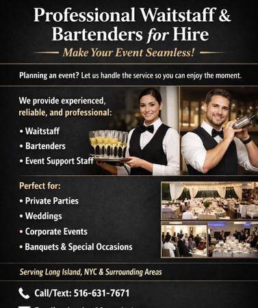 Hosting an event? Let our professional waitstaff and bartenders take care of the service so you can relax. We offer reliable and skilled staff for private parties, weddings, corporate events, banquets, and more. Our team is punctual, well-presented, and trained to provide excellent service. Whether you need a small team or full event staffing, we are here to help. Serving East Elmhurst, NY and nearby areas. Call or text 516-631-7671 to book your staff today.